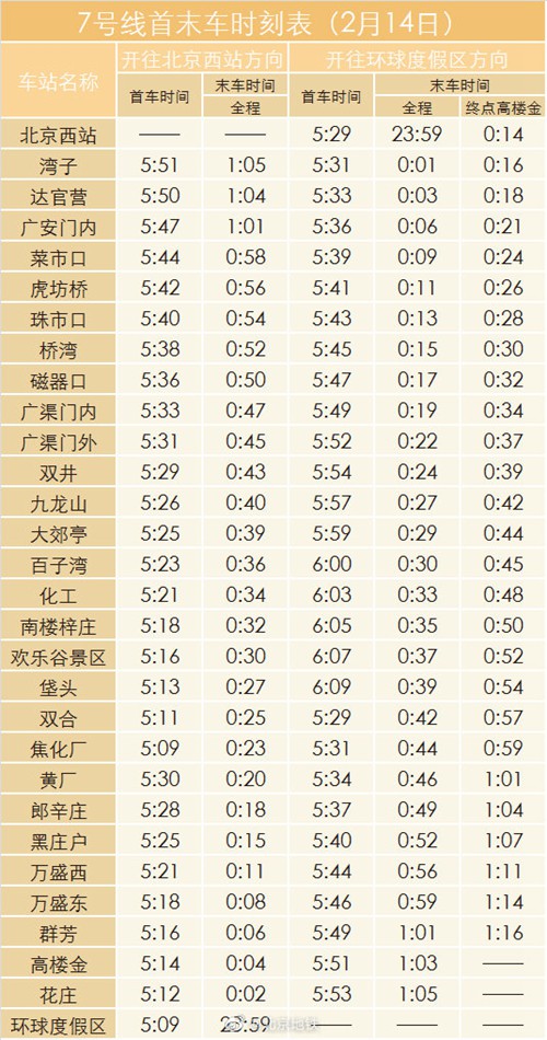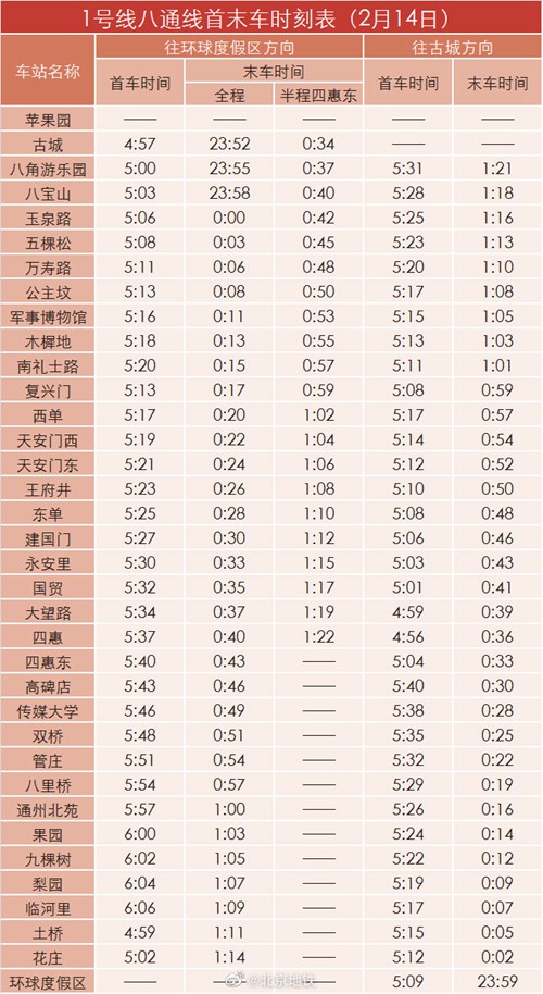 2月14日晚北京地鐵1號線八通線、2號線、7號線延長運(yùn)營時(shí)間