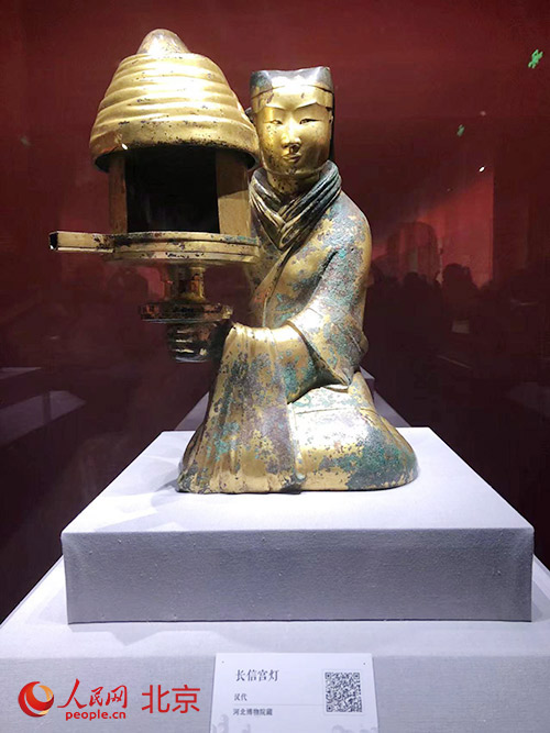 長信宮燈是2000多年前的西漢宮燈,造型輕巧華麗,設(shè)計(jì)巧妙環(huán)保。人民網(wǎng)記者 鮑聰穎攝