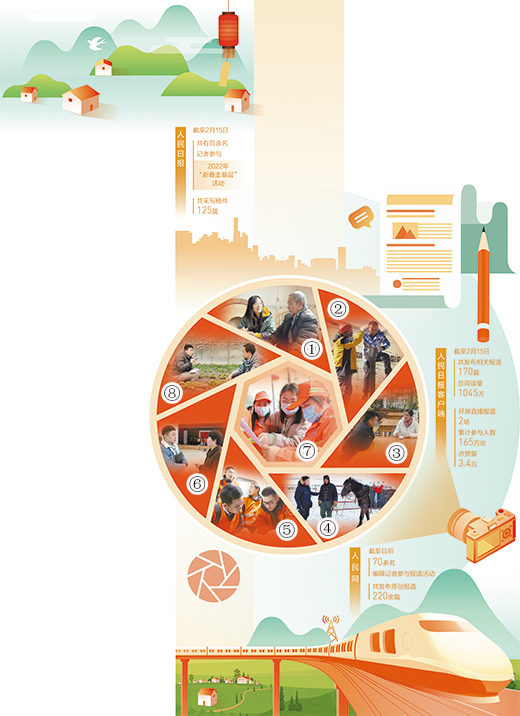 圖①至圖⑧依次為本報重慶分社記者常碧羅(左)、青海分社記者賈豐豐(右)、湖南分社記者王云娜(右)、內蒙古分社記者吳勇(左)、福建分社記者劉曉宇(左)、浙江分社記者竇瀚洋(左)、廣西分社記者祝佳祺(中)及人民網(wǎng)記者馮亞濤(左)在春節(jié)期間深入基層采訪。