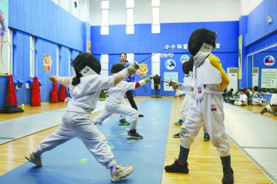 昨天,小學(xué)生在鼓樓區(qū)南財大附小參加擊劍社團(tuán)活動。 南京日報/紫金山新聞記者 徐琦 攝