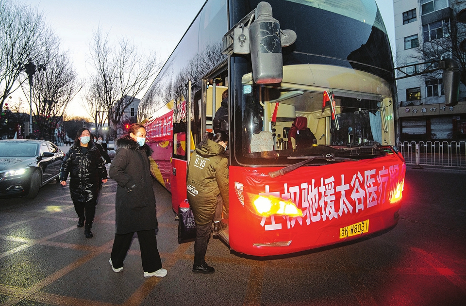 2月22日,左權(quán)縣馳援太谷區(qū)核酸采樣服務(wù)隊(duì)醫(yī)護(hù)人員乘專車赴太谷開(kāi)展核酸檢測(cè)采樣工作。這是繼2月20日,該縣派出的第三批援谷醫(yī)護(hù)人員。(張文軍攝)