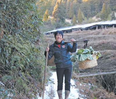 官兵們駐扎的大山峰平均海拔1000米左右,山路崎嶇陡峭,僅能容一人通過,單程就要一個(gè)多小時(shí)。葉美英每周上山兩次,一條扁擔(dān),一根木杖,扁擔(dān)兩端的筐里裝滿了自家種的青菜、包菜、茄子。最多的時(shí)候,這條磨得發(fā)黑的扁擔(dān)上挑過重達(dá)140斤的蔬菜。挑累了,葉美英就用木杖支撐著扁擔(dān),簡單休息之后,繼續(xù)上山。