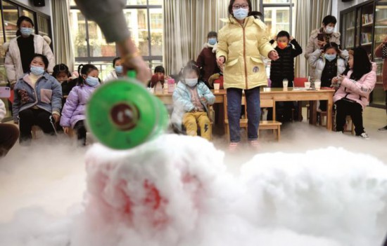 日前,嘉興市秀洲區(qū)高照街道秀清社區(qū)請來科技館老師,將兒童科學實驗課堂搬到社區(qū),讓孩子們在家門口就能上有趣又好玩的科學實驗課。(馮玉坤)