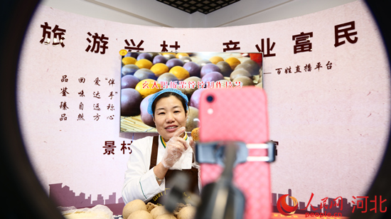 遷安市山葉口村村民劉海霞正在通過村史館里的“百姓直播平臺”銷售板栗餑餑等特色農(nóng)產(chǎn)品。 康永利攝