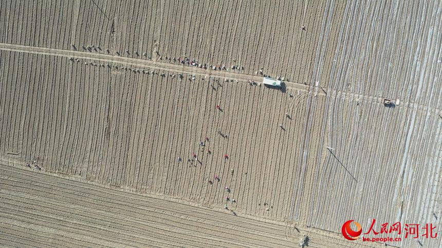 在河北省邯鄲市邱縣古城營(yíng)鎮(zhèn)東杜林疃千畝西蘭花基地,村民正在栽植西蘭花苗(無人機(jī)照片)。孫海峰攝
