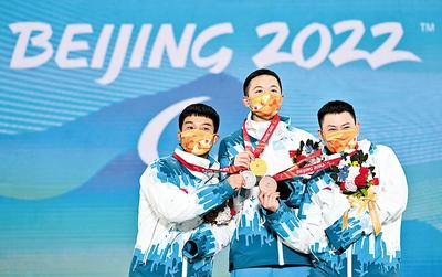 3月7日,北京冬殘奧會(huì)殘奧單板滑雪男子障礙追逐UL級(jí)比賽在云頂滑雪公園舉行,三位來(lái)自河北的“零零后”選手紀(jì)立家、王鵬耀、朱永鋼分獲金、銀、銅牌,取得了我國(guó)、河北省在冬殘奧會(huì)該項(xiàng)目的歷史性突破。當(dāng)晚該項(xiàng)目的頒獎(jiǎng)儀式上,3面五星紅旗同時(shí)升起,激動(dòng)人心。