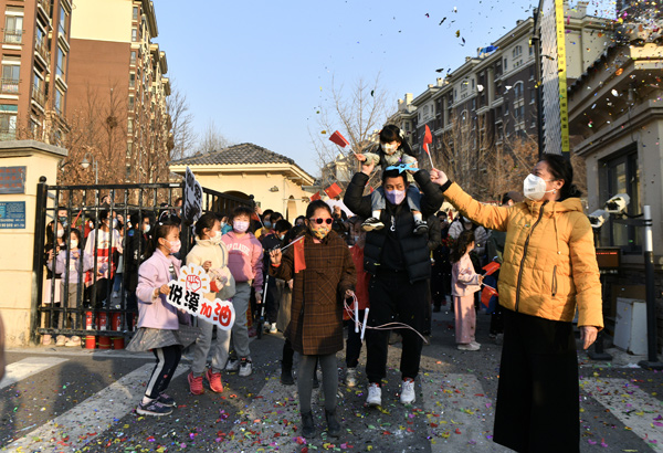 在潤澤悅溪小區(qū)門口,工作人員快速拆除快遞架,小區(qū)大門緩緩打開,居民們興高采烈地結伴走出小區(qū)。社區(qū)黨委書記、居委會主任分別向志愿者代表頒發(fā)證書并送上鮮花,向入駐社工、民警、機關工作人員獻上鮮花,為社區(qū)衛(wèi)生服務中心和來廣營派出所送錦旗,為愛心企業(yè)頒發(fā)獎牌。居民代表向社區(qū)黨委及小區(qū)物業(yè)送錦旗。3月8日也是國際婦女節(jié),地區(qū)特意制作了電子賀卡,為每位女性同胞送上節(jié)日祝福。