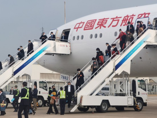 3月10日下午,在滬全國政協(xié)委員乘東航班機(jī)返滬。上海市政協(xié)供圖