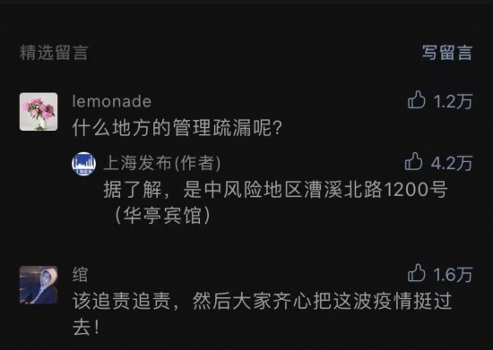 是什么地方的“疏漏”?“上海發(fā)布”在留言區(qū)直白回復(fù)網(wǎng)友:“據(jù)了解,是中風(fēng)險地區(qū)漕溪北路1200號(華亭賓館)”。