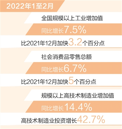 工業(yè)、服務(wù)業(yè)逐步回升。1至2月,全國(guó)規(guī)模以上工業(yè)增加值同比增長(zhǎng)7.5%,比2021年12月加快3.2個(gè)百分點(diǎn),41個(gè)大類行業(yè)中超過(guò)九成行業(yè)實(shí)現(xiàn)增長(zhǎng);全國(guó)服務(wù)業(yè)生產(chǎn)指數(shù)同比增長(zhǎng)4.2%,比2021年12月加快1.2個(gè)百分點(diǎn)。