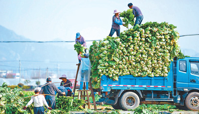 3月16日,浙江省溫嶺市石橋頭鎮(zhèn)沙角村,農戶正忙著收割、裝運油芥菜。隨著春耕備耕在即,農戶及時搶收早春蔬菜,騰空農田種植早稻。