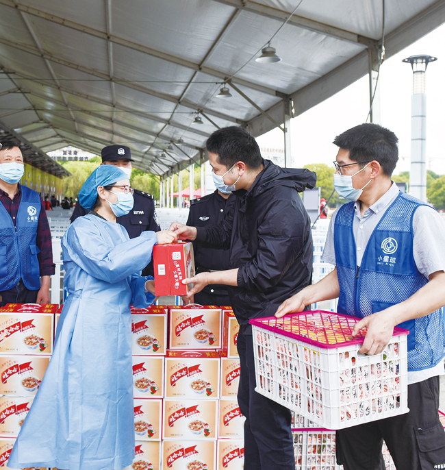 3月17日,志愿者給金華市金東區(qū)方艙核酸采樣站抗疫一線醫(yī)護人員、公安民警,送去水果、八寶粥、草帽等價值5000余元的物資。金東區(qū)方艙核酸采樣站有120多名工作人員,24小時為市民進行免費核酸采樣。(李建林)