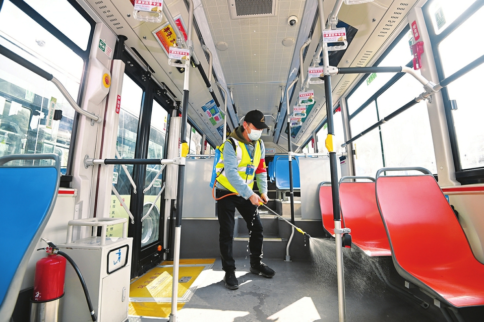 3月16日,太原公交三公司三車隊內(nèi),工作人員正在對公交車座位、拉手進(jìn)行消殺,嚴(yán)格執(zhí)行疫情防控措施,確保市民乘車安全。(記者阮洋攝)