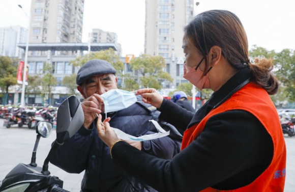 志愿者在街頭為群眾免費發(fā)放口罩,宣傳防疫知識。張莉琳攝
