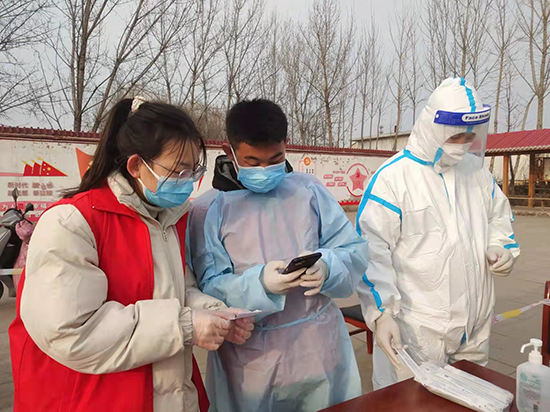 遷安市太平莊鎮(zhèn)蘇各莊營村大學(xué)生志愿者掃碼登記。 商立超攝