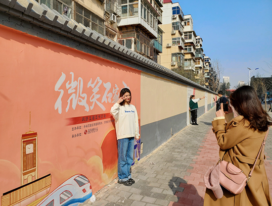 市民在“微笑墻”打卡拍照。 石家莊網信辦供圖