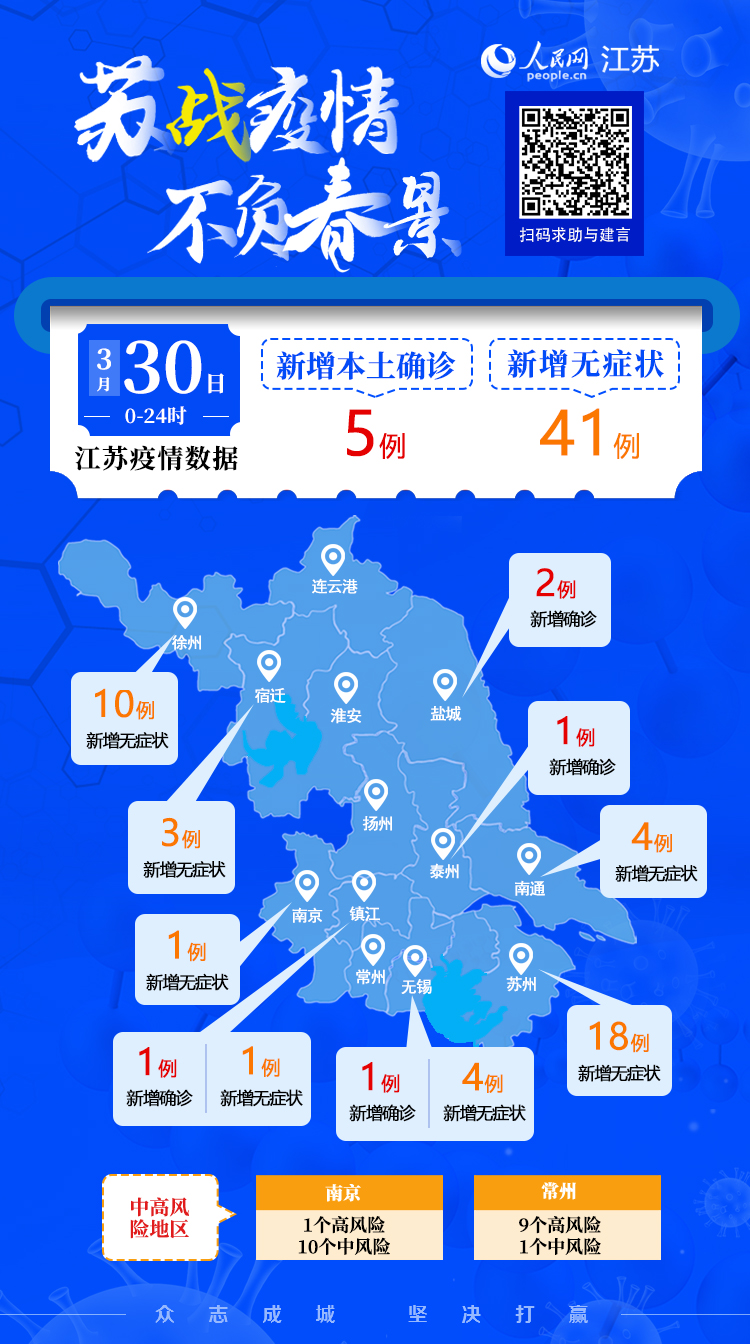 3月30日江蘇新增本土確診病例5例 本土無癥狀感染者41例