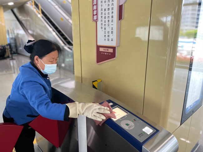 在站臺、站廳等重點(diǎn)區(qū)域,盡管沒有了客流,海寧運(yùn)營公司根據(jù)車站實(shí)際需求維持了每日3至4次的消殺頻次。