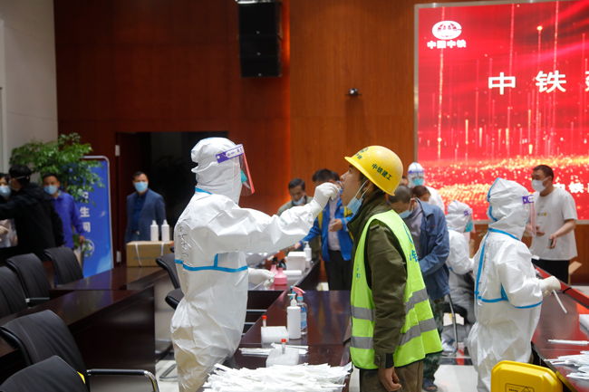 建設(shè)者在湖杭鐵路杭州西站指揮部大會議室內(nèi)做核酸檢測。周蕊攝