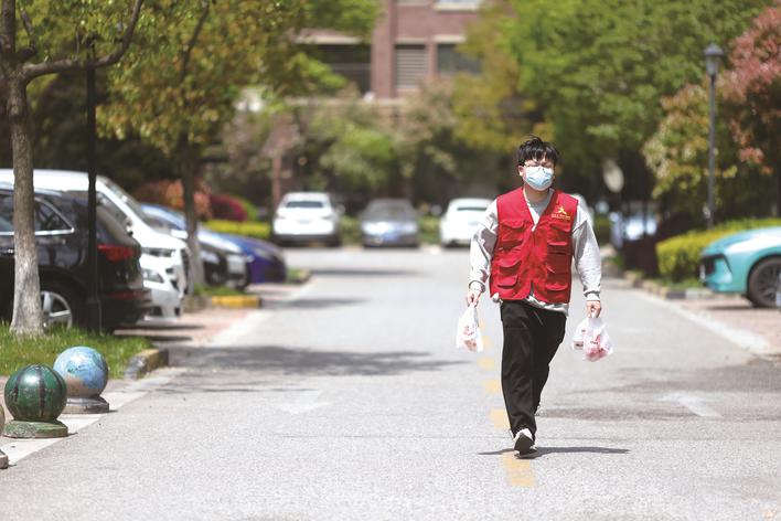 4月6日上午,在嘉興秀洲區(qū)高照街道運(yùn)秀社區(qū),社區(qū)黨員志愿者李斌行走在給居民送藥的路上。