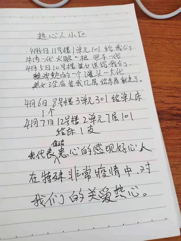 “4月5日,11號樓1單元101,給我們牛肉一袋,火腿一根,包子一袋;4月5日,10號樓送來整雞一個,饅頭一大袋,但是沒有留下具體門牌就走了;4月6日,8號樓3單元301給單人床一個;4月7日,12號樓2單元7層101給床一個。我代表保潔衷心地感謝好心人,在非常時期,對我們的關愛?!?/p>
