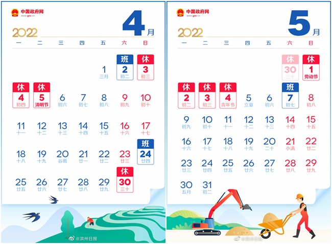 根據(jù)國(guó)務(wù)院辦公廳通知精神,現(xiàn)將2022年勞動(dòng)節(jié)放假安排通知如下: 4月30日(星期六)至5月4日(星期三)放假調(diào)休,共5天。4月24日(星期日)、5月7日(星期六)上班。 請(qǐng)廣大市民提前安排好工作生活,節(jié)日期間注意安全,減少人員聚集,加強(qiáng)個(gè)人防護(hù),度過(guò)一個(gè)歡樂(lè)、祥和的節(jié)日假期。