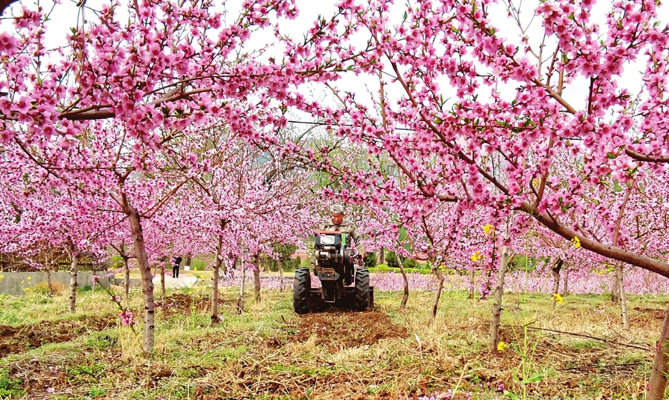 4月12日,左權(quán)縣上武村百畝桃園花開太行,農(nóng)民正在使用拖拉機(jī)松土施肥耕作管護(hù)。上武村地處太行百里畫廊的核心區(qū)域,近年來,該村積極推動農(nóng)旅融合,發(fā)展生態(tài)旅游,每到春天,連片的桃花競相綻放、美如云霞,構(gòu)成一幅太行田園風(fēng)光圖,吸引了游客踏青賞春,促進(jìn)了產(chǎn)業(yè)發(fā)展農(nóng)民增收。(邢蘭富攝)