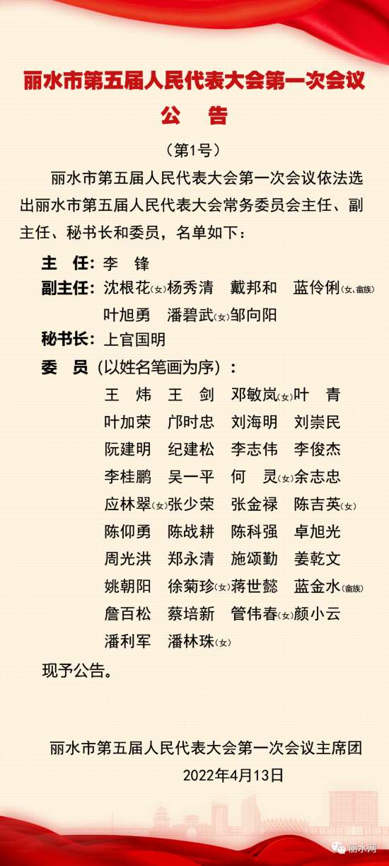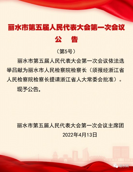 4月13日上午,麗水市五屆人大一次會(huì)議舉行第三次全體會(huì)議,選舉產(chǎn)生麗水市人大常委會(huì)主任、副主任、秘書長(zhǎng)和委員,麗水市人民政府市長(zhǎng)、副市長(zhǎng),麗水市監(jiān)察委員會(huì)主任,麗水市中級(jí)人民法院院長(zhǎng),麗水市人民檢察院檢察長(zhǎng)。