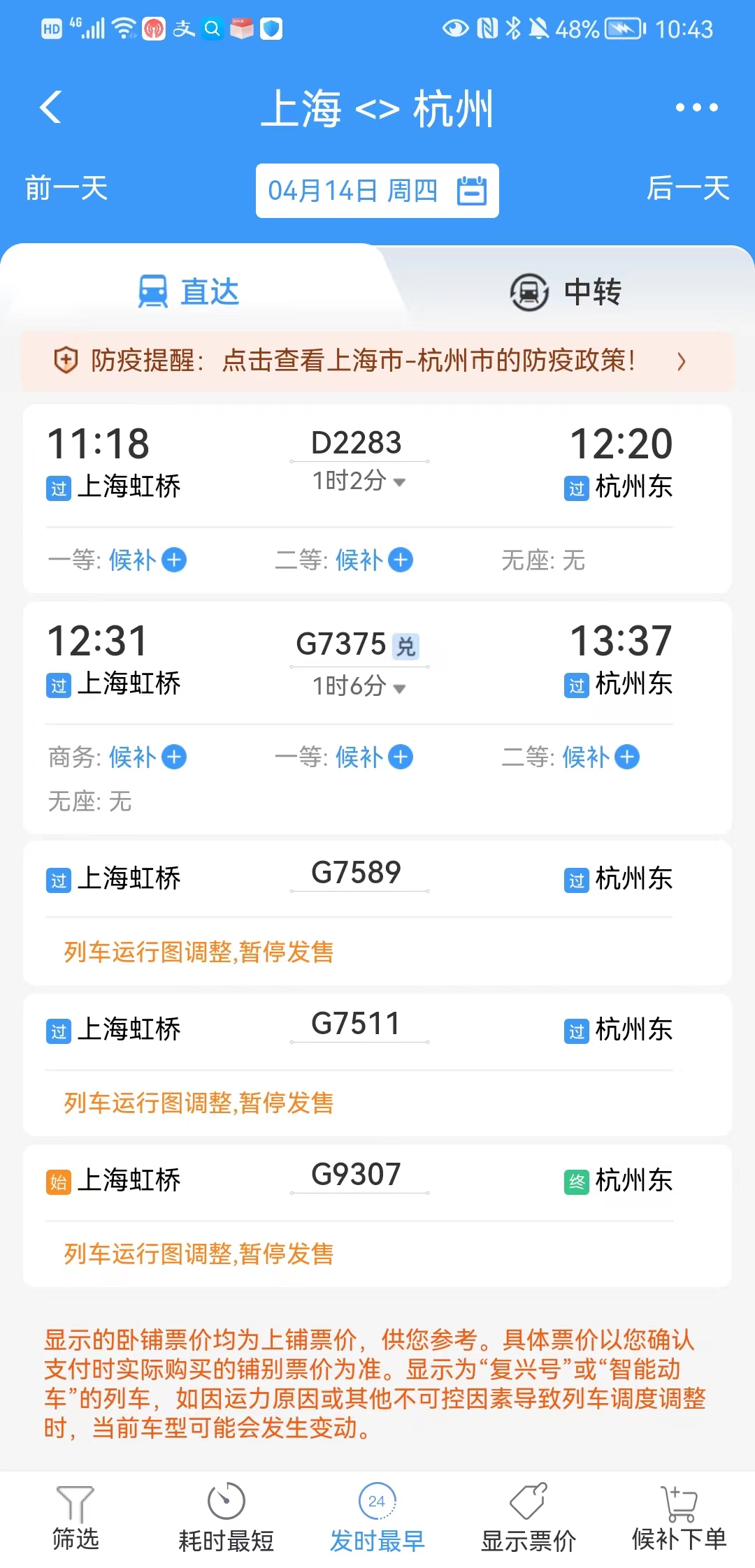 以查詢4月14日上海-杭州的火車票為例,僅剩的5趟列車中,D2283、G7375只是從上海虹橋站經(jīng)過,車票售罄是因為買票的幾乎都是別的城市上車的旅客,實際從虹橋站上車的旅客幾乎沒有;另外兩趟在上海虹橋站的過路車(G7589、G7511)和一趟始發(fā)車(G9307)干脆已暫停發(fā)售車票,更不存在大量上海出發(fā)旅客買票的可能。