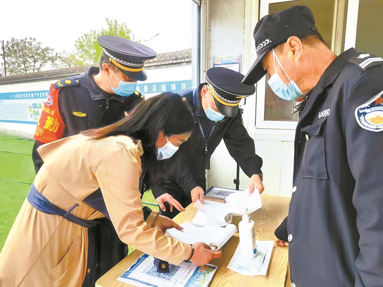 馮向軍(右二)查看施工單位疫情防控臺賬。