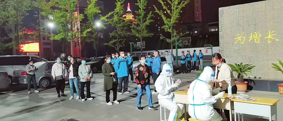 在太原市第三十中學(xué),醫(yī)務(wù)人員為該校師生做核酸檢測(cè)。