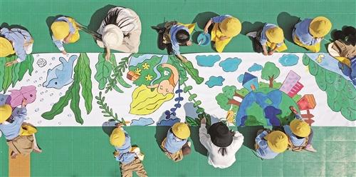 4月21日,臺(tái)州仙居縣幼兒園的孩子們?cè)诶蠋熤笇?dǎo)下創(chuàng)作珍愛(ài)地球主題繪畫(huà)作品。當(dāng)日,幼兒園開(kāi)展以“珍愛(ài)地球 人與自然和諧共生”為主題的教育活動(dòng),迎接“世界地球日”到來(lái)。通過(guò)繪長(zhǎng)卷、環(huán)保時(shí)裝秀、垃圾分類(lèi)等教育活動(dòng),引導(dǎo)孩子們愛(ài)護(hù)環(huán)境,共同守護(hù)地球母親。