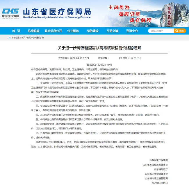 為適應(yīng)新冠病毒肺炎疫情防控形勢要求,減輕群眾負(fù)擔(dān),在已有效降低核酸檢測試劑及配套耗材價(jià)格、降低核酸檢測物耗成本基礎(chǔ)上,進(jìn)一步降低新型冠狀病毒核酸檢測價(jià)格。山東省各級公立醫(yī)療機(jī)構(gòu)、縣級以上疾病預(yù)防控制機(jī)構(gòu)新型冠狀病毒核酸檢測單人單檢(含檢測試劑)最高價(jià)格為24元/次;按照衛(wèi)生健康部門技術(shù)規(guī)范進(jìn)行的新型冠狀病毒核酸混合檢測,不區(qū)分樣本數(shù)量,最高價(jià)格為4元/人次,不得另外收取檢測試劑等其他費(fèi)用。