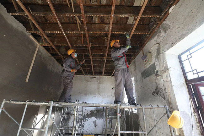 按照計劃,樓頂將由原來的木質(zhì)大屋脊整體更換為樹脂瓦阻燃屋面。而在第一階段改造中,樓體阻燃,為居民量身訂制燃?xì)夤?,配?4小時巡護(hù)“管家”,每天進(jìn)行巡查記錄并拍攝現(xiàn)場照片均已完成。一層的臨街房屋內(nèi)的夾層已經(jīng)拆除完畢,木制窗已經(jīng)更換為塑鋼窗,原來的薄墻面上加裝硅酸鈣板,地面鋪設(shè)了耐火地板磚,屋頂?shù)跹b了石膏板。二層樓內(nèi)木樓板已鋪設(shè)耐火瓷磚,樓內(nèi)電線電纜進(jìn)行了梳理排查,完成了整體更換,鋪設(shè)了不銹鋼槽式電纜橋架,確保樓內(nèi)居民用電安全穩(wěn)定。