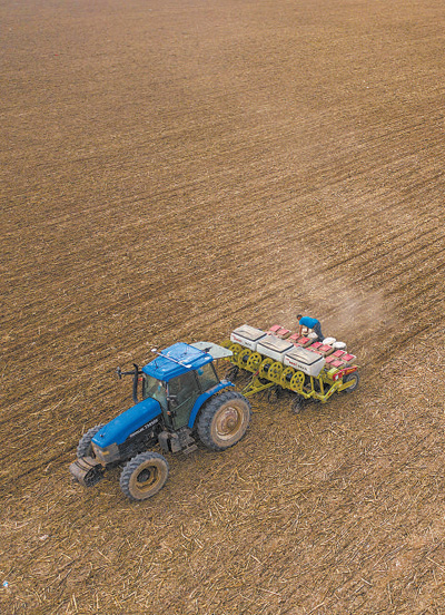 新疆維吾爾自治區(qū)博樂(lè)市6萬(wàn)畝“免耕玉米”開(kāi)播?!懊飧衩住辈皇褂玫啬?,一次性完成播種、施肥、滴灌帶淺埋機(jī)械化作業(yè),可減少白色污染等。