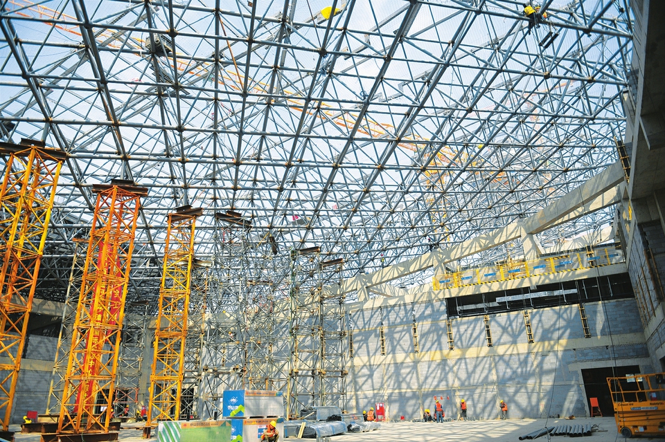 4月24日,瀟河國際會議中心建設現場,施工人員在做好疫情防控的基礎上,嚴守安全生產底線,搶抓施工進度。(記者王瑞瑞攝)