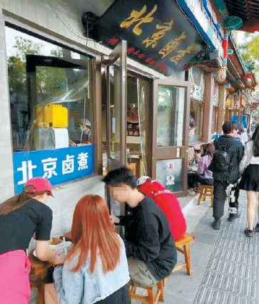 以什剎海游覽區(qū)東北角為例,沿街的小吃窗口相對(duì)密集,這些窗口附近正好是長(zhǎng)長(zhǎng)的臺(tái)階。從下午到傍晚,游客們像走進(jìn)了階梯教室一樣,人擠人、人挨人地坐到了臺(tái)階上,烤串、爆肚、熟食席地?cái)[放,用餐人員的密集程度比堂食還要高。