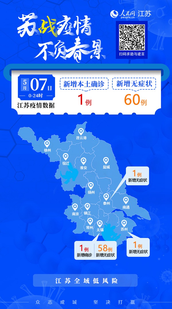 - 5月7日江蘇新增1例本土確診病例 60例本土無癥狀感染者