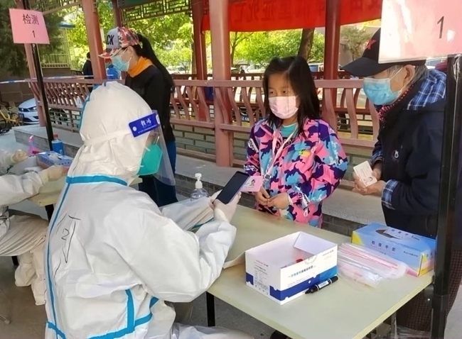 在海淀區(qū)石佛寺曙光小型消防站核酸檢測點,95后“大白”張利紅正在為居民進行核酸采樣。此前,作為人大幼兒園保健醫(yī)的她,已經(jīng)多次參與核酸檢測采樣工作,也一直希望能夠為自己工作的地區(qū)做貢獻。通過單位了解到街道的核酸檢測點正在招募志愿者后,張利紅第一時間報了名,成為了社區(qū)采樣點的一名“大白”。