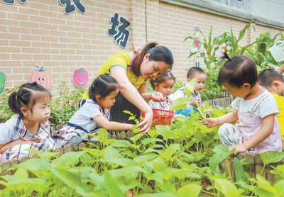 江西省贛州市全南縣幼兒園通過開展“合理營養(yǎng)與健康飲食”主題教育活動,引導(dǎo)孩子們均衡營養(yǎng)、珍惜糧食。圖為老師在幼兒園快樂農(nóng)場教小朋友們采摘蔬菜。