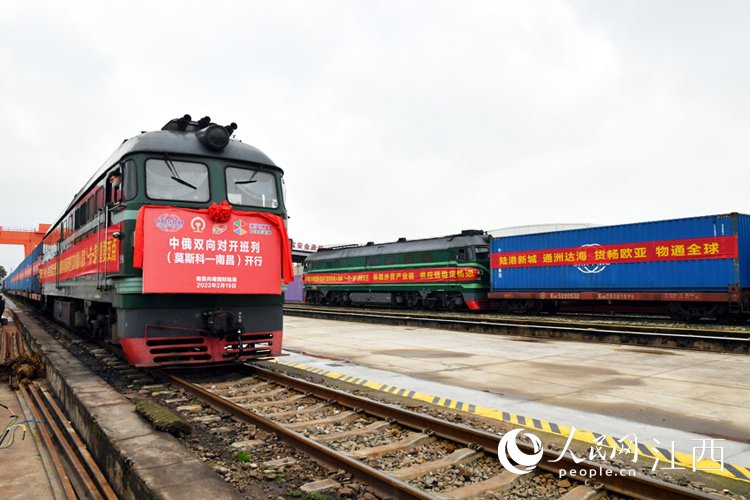 2月19日,2022年江西省首列中俄雙向?qū)﹂_班列(南昌—莫斯科)在南昌向塘國(guó)際陸港成功到發(fā)?!皩?duì)開班列”的開行將大大提高集裝箱周轉(zhuǎn)效率,降低企業(yè)運(yùn)輸成本。 人民網(wǎng) 時(shí)雨攝