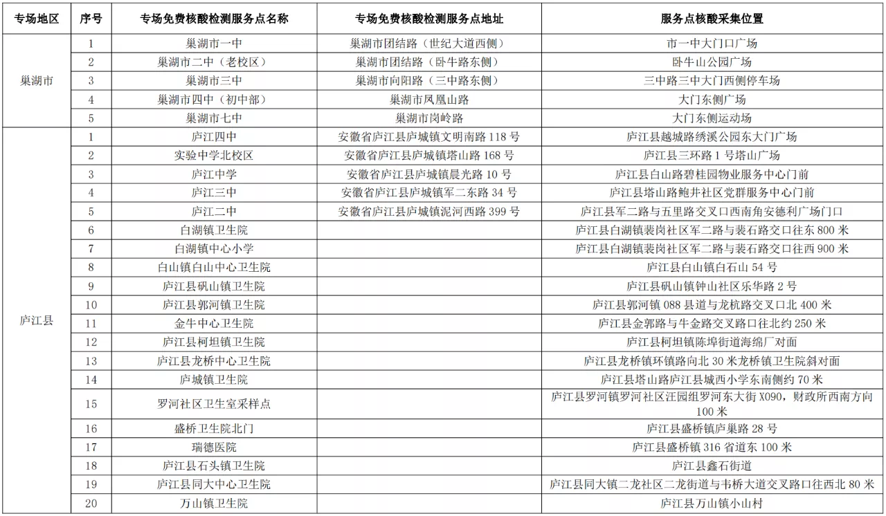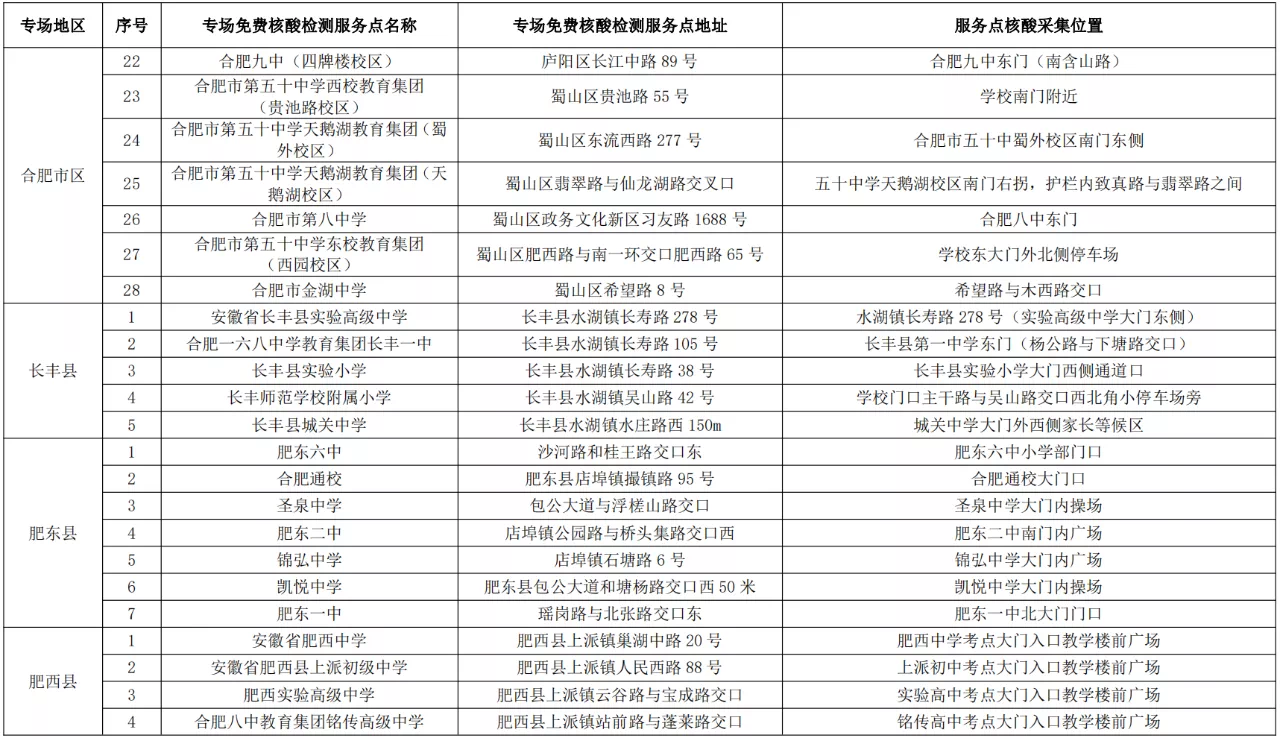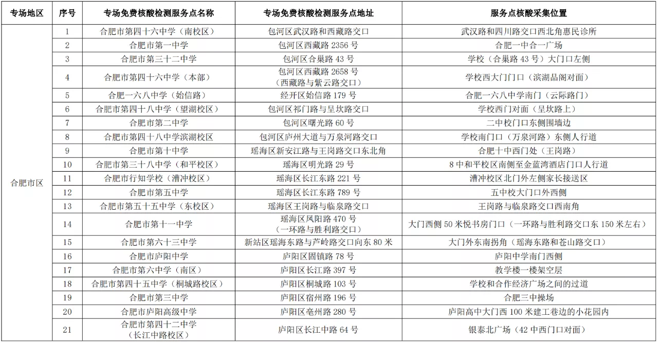 根據(jù)要求,各專場免費(fèi)核酸檢測服務(wù)點(diǎn)僅對合肥市高考考生提供服務(wù),考生可持準(zhǔn)考證、安康碼就近到專場免費(fèi)核酸檢測服務(wù)點(diǎn)進(jìn)行核酸采樣,具體檢測點(diǎn)主要設(shè)在高考考點(diǎn)周邊。