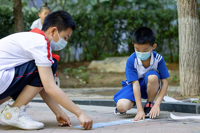 陶然亭街道大吉巷社區(qū)的一處核酸點(diǎn)位上,兩米線安全提示標(biāo)識引起大伙兒注意。“避免聚集,嚴(yán)防疫情”“綠色出行,愛心助考”“文明陪考,安全第一”……誰能想到這些醒目的標(biāo)語竟然是“陶然娃”們想的“愛心助考公約”?!榜R上就是高考了,希望哥哥姐姐們能取得好成績,不辜負(fù)自己多年的努力?!?3歲的陳博一趴在地上,奮力的拍了拍自己剛剛貼好的“公約宣傳條”。