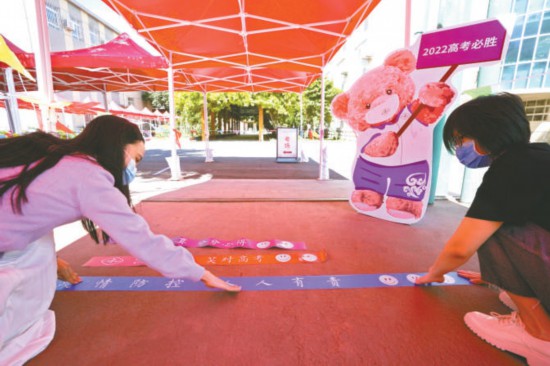 昨天上午,中國(guó)地質(zhì)大學(xué)附屬中學(xué)考點(diǎn)正在進(jìn)行考點(diǎn)布置工作。兩米線上除了疫情提示,還印有“沉著冷靜 笑對(duì)高考”“自信認(rèn)真 分分必得”等祝福語(yǔ)。本報(bào)記者 王海欣攝