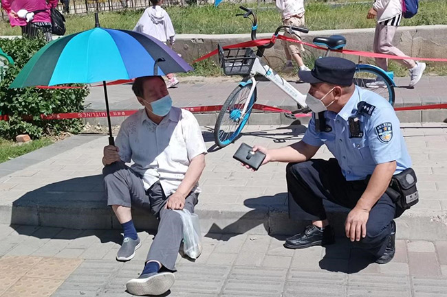 朝陽(yáng)民警馬占富為摔倒老人提供幫助。朝陽(yáng)公安分局供圖