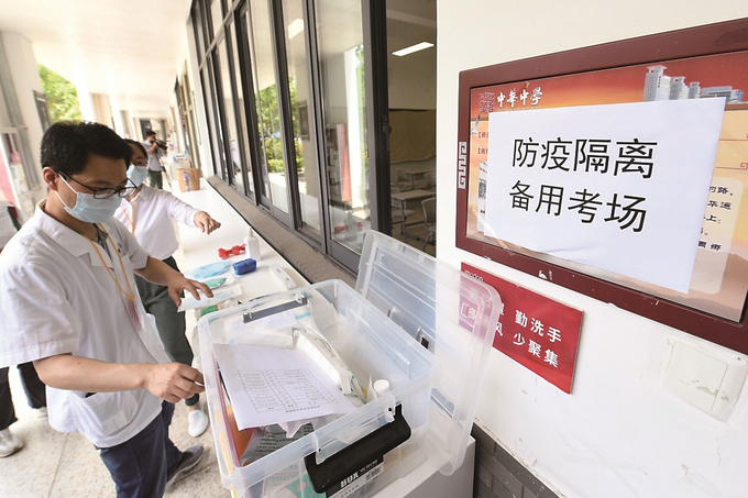 “速干手消毒劑、防護(hù)面屏+護(hù)目鏡、污染物應(yīng)急處置包、紫外線消毒燈車……”在備用隔離考場(chǎng)外,中華中學(xué)考點(diǎn)副主任、防疫副主考單良介紹防疫物資清單。他說:“考點(diǎn)儲(chǔ)備了考生、考務(wù)人員所需的口罩、含氯消毒劑、速干手消毒劑、紙巾等物品。按文件要求配備5個(gè)備用隔離考場(chǎng)、2個(gè)備用考場(chǎng)。6日前,我們已經(jīng)對(duì)所有考場(chǎng)進(jìn)行預(yù)防性消毒,每天考試結(jié)束對(duì)考場(chǎng)、通道等區(qū)域進(jìn)行常規(guī)消毒,考試期間按要求進(jìn)行開窗通風(fēng),責(zé)任到人。”