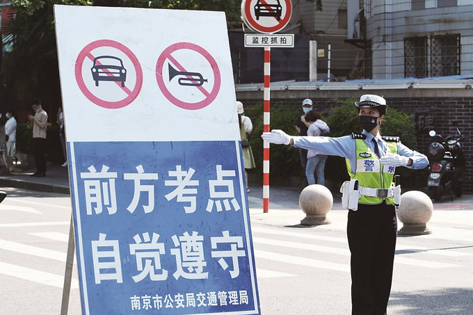 “今年考生家長大多選擇地鐵、公交等公共交通工具到達考點,周邊居民和在附近上班的人員也都能理解配合,高考現(xiàn)場環(huán)境一年比一年好?!蹦暇┙痪淮箨爤?zhí)勤二中隊中隊長錢臣表示??键c現(xiàn)場,交警也對非機動車駕駛人員進行友情提醒,請他們不要按喇叭。在南京市第一中學考點,南京交警三大隊副大隊長桂子振告訴記者,“下午1點,我們就在考點周邊路口安排3名民警巡邏。”在各考點周邊道路,交警均擺放了疏導車輛的交通標志,并實時為考生提供幫助。