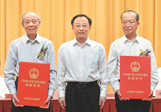 六月九日,省委、省政府舉行全省科學技術(shù)獎勵大會。吳政隆為榮獲二〇二〇年度省科學技術(shù)突出貢獻獎的中國工程院院士、中國電子科技集團第十四研究所教授賁德(右)和中國科學院院士、南京大學教授鄭有炓頒獎并合影。 本報記者 吳勝 朱江 攝