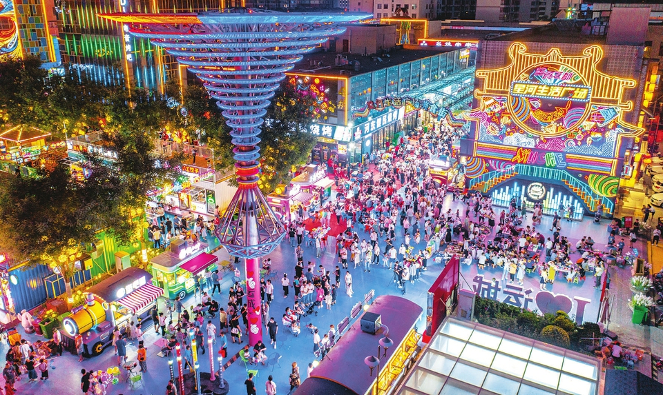 6月11日晚,市民在運(yùn)城市鹽湖區(qū)星河生活廣場消夏。鹽湖區(qū)升級(jí)改造后的星河生活廣場燈光璀璨、人流如織,人們紛紛前來打卡、購物消費(fèi)。(閆鑫攝)
