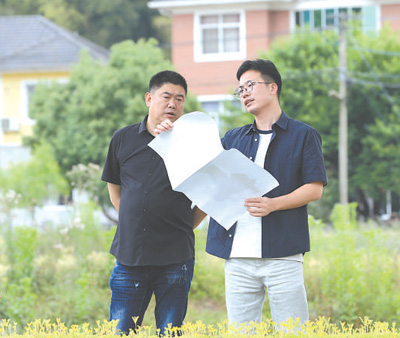 浙江省杭州市臨安區(qū)天目山鎮(zhèn)駐鎮(zhèn)規(guī)劃師金宇航(右)在現(xiàn)場(chǎng)踏勘。